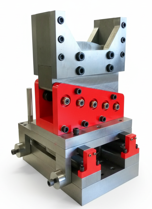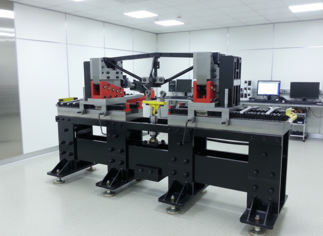 Heavy-duty precision-machined clamping blocks and V-seats for the beam pivots, maintaining geometric consistency over the entire fatigue cycle duration.